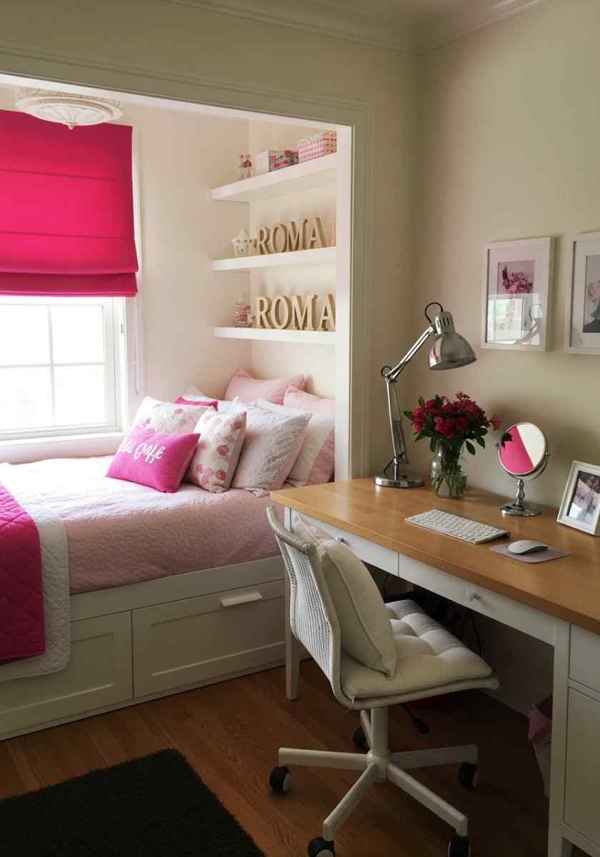 Tiny bedroom ideas for her don’t need to be boring. This alcove bed with drawers underneath is perfect for studios or teen rooms. The key move is running a full desk along the opposite wall so sleep and study share the space without fighting. A bright pink roman shade gives the nook personality. Keep bedding light pink and white to calm the color. Stack shelves with labeled boxes and framed prints to keep it cute, not messy. Put a task lamp on a pivot arm so you can angle light for laptop work or makeup. I like to add a thin cushion on the desk chair to soften long study nights. It’s functional, yet playful.