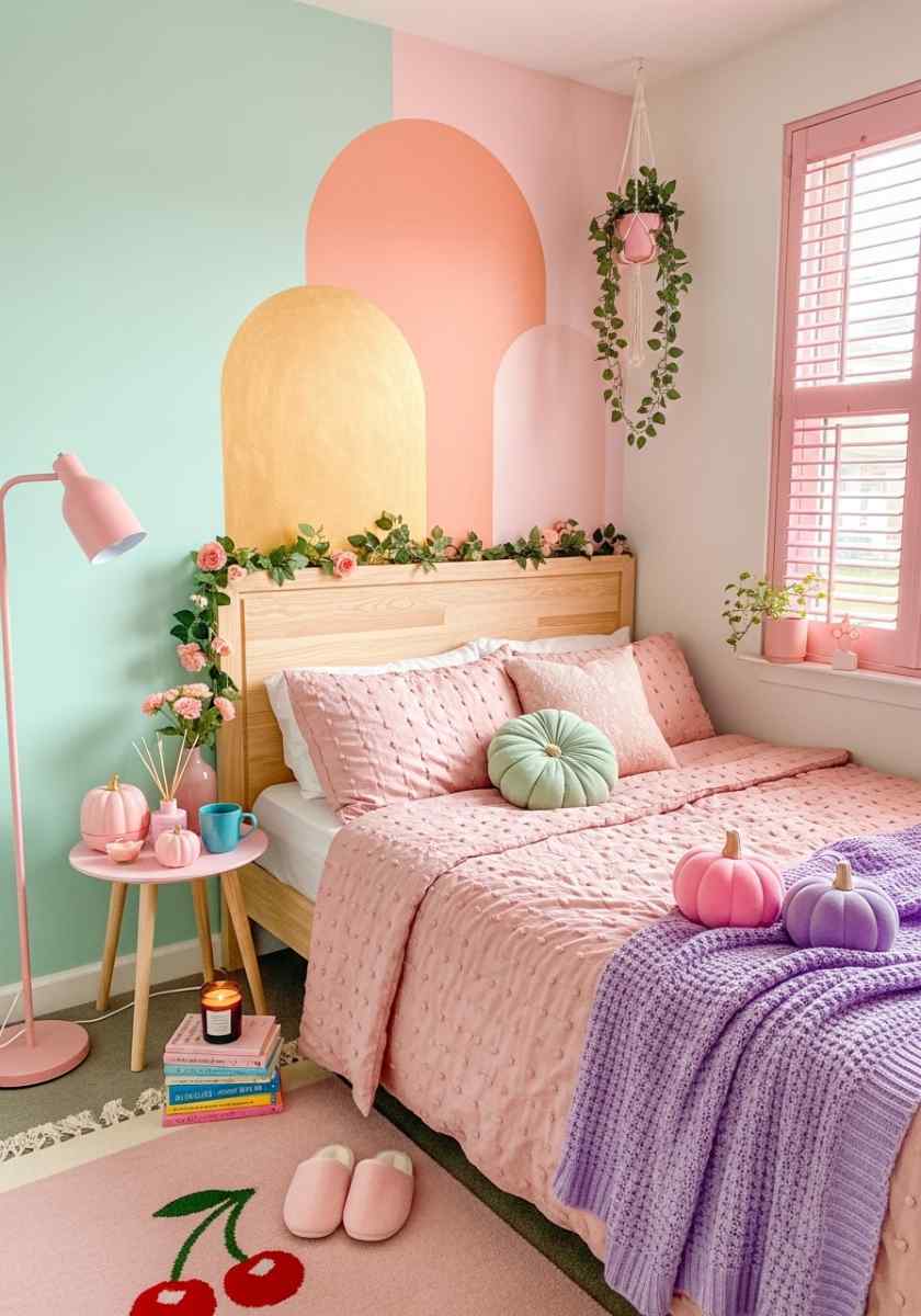 I’m a sucker for a good paint trick. This room proves small bedroom ideas for women can go bold with color and still feel light. The mint and blush walls are sweet, but the peach and gold arch mural behind the headboard steals the show. If you can trace around a bowl, you can paint this. Layer a dotted pink duvet, lilac knit throw, and pastel pumpkins as accents. Keep the bedside table slim with a pink floor lamp for reading. Add a tiny vase of ranunculus or roses to echo the wall colors. The garland of faux greenery softens the headboard line and frames the artwork. It’s cheerful and very “she space” without clutter.