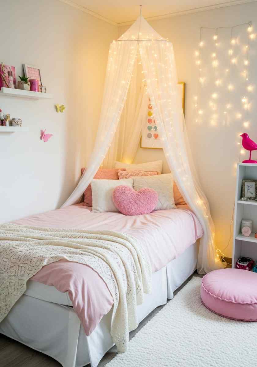 This is the softest of the group and one of the most pinned women’s small bedroom ideas I’ve used. A round canopy ring hangs from the ceiling with long sheer panels that pool a bit at the floor. Weaving micro string lights through the top makes it sparkle at night. Bedding stays blush and white with a heart pillow in the center. For warmth, layer a lace knit throw and a white shag rug. Keep storage simple with a small shelving unit and baskets. It’s easy to maintain and feels like a dreamy cocoon. I promise, even grown women like a little romance if the palette stays simple.