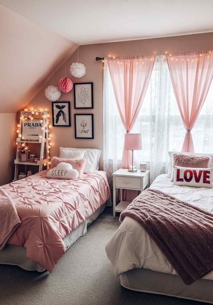 Sharing doesn’t mean losing style. This space shows girly small bedroom decor that’s balanced and sweet. Two twin beds keep floor area open. Repeat blush bedding on both sides but change one throw to white so it doesn’t feel too matchy. A single nightstand between beds with a glass lamp saves space. Hang a few prints grouped tight, then drape fairy lights along the curtain rods to outline the window. I’ve done this layout in attic rooms where angles get weird. The trick is symmetry plus small differences so each person feels seen. Add a ladder shelf in the corner with baskets labeled by name to keep stuff from mixing.