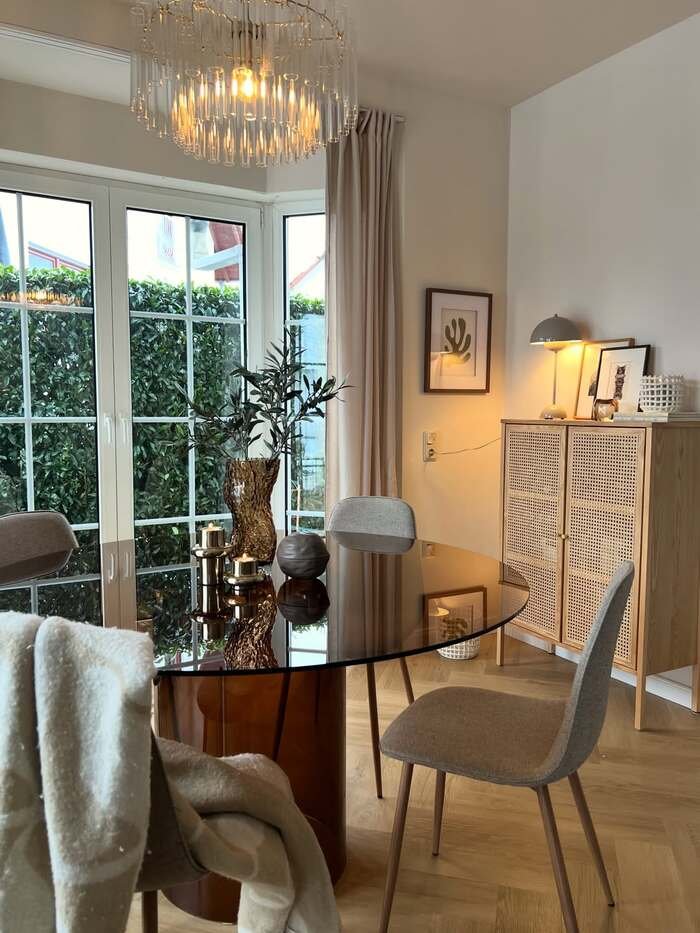 A glass tabletop is a sneaky trick. In the first photo, the oval glass lets the floor and sunlight show through, so the table doesn’t feel like a heavy block. The soft gray chairs stay low and calm, and the room feels brighter. This is one of those small dining room decor ideas that makes a cramped corner feel breathable. It just feels lighter.