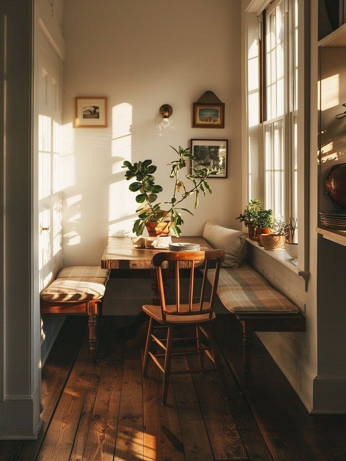 The benches are the main trick. Chairs in tight spaces get annoying fast, they bump walls and block walking paths. Benches stay tucked in, which is why this works as one of the best small dining nook decor ideas. Add cushions that match (or at least don’t fight), and keep the tabletop clear except for something living, like a plant.