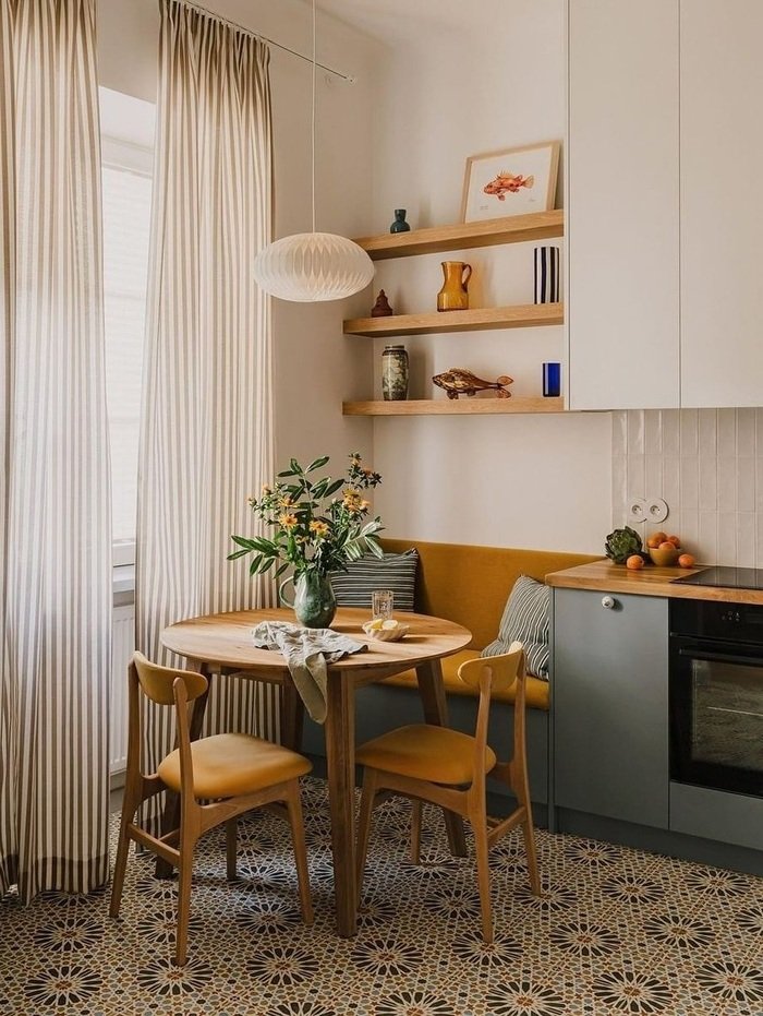 This kitchen nook is such a clever combo: round table, mustard bench seat, and that patterned floor that makes everything feel intentional. Patterned flooring is a sneaky cheat for small dining room decor ideas because it adds personality without needing extra furniture. And the banquette makes the space feel built-in, like it was planned from the start.