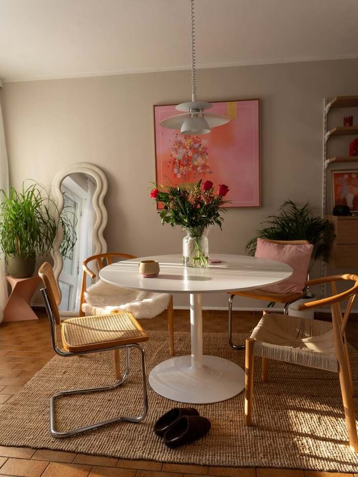 This one feels like a real person lives here, and I mean that as a compliment. The white pedestal table is a classic move for small dining room decor ideas because it keeps the bottom area open. No messy table legs going everywhere. The mix of chairs also makes it feel collected, not like you bought a matching set on the same day. The jute rug warms it up, and that wavy mirror leaning on the wall is giving “I’m artsy but also kinda lazy.”