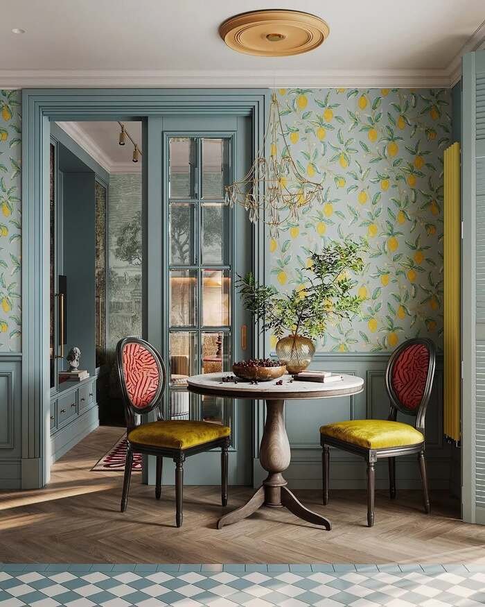 This room is dramatic in the best way. Lemon wallpaper, blue-green trim, patterned floor, and then a tiny round table like a little café moment. If you want bold small dining room decor ideas, this is it. The table is small, but the room has personality for days. That’s the trick: you don’t need more furniture, you need stronger design choices.