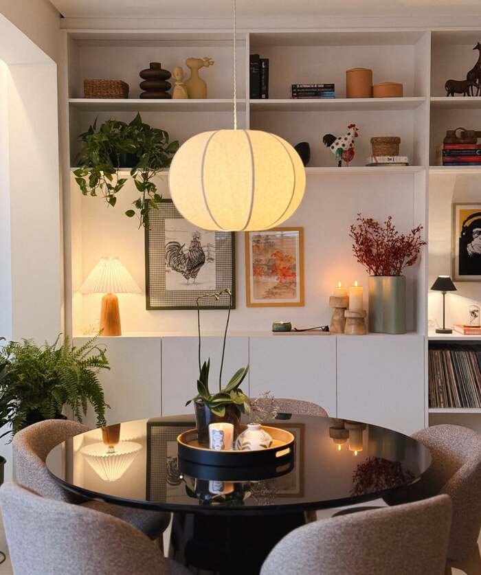 This setup is cozy and clean at the same time. The glossy black round table reflects light, so it doesn’t feel heavy, which is a smart move for small dining room decor ideas. The chairs are soft and rounded, and that big paper lantern overhead makes everything feel gentle. The background shelves are the real power move though, they give storage and style without adding more furniture.