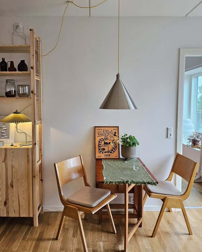 This photo is proof that small dining room decorating ideas can be simple. It’s a petite square table, two wooden chairs, and one pendant that clearly marks the eating zone. I like the warm wood because it feels friendly, like a café corner, even if you’re just eating cereal. A soft seat pad helps too.