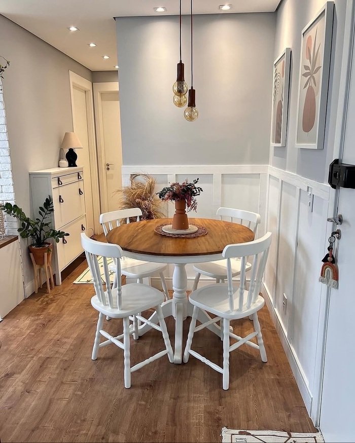 This room is narrow, but the round table makes it feel softer and easier to walk around. Round tables are a comfort pick for small dining room decor ideas because they keep paths clear. The light chairs help too, they don’t add extra visual weight. The wainscoting style trim makes the wall feel finished and tidy. No wasted corners.