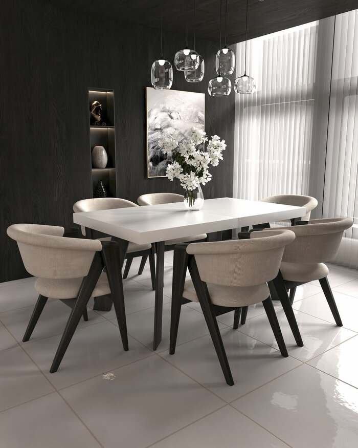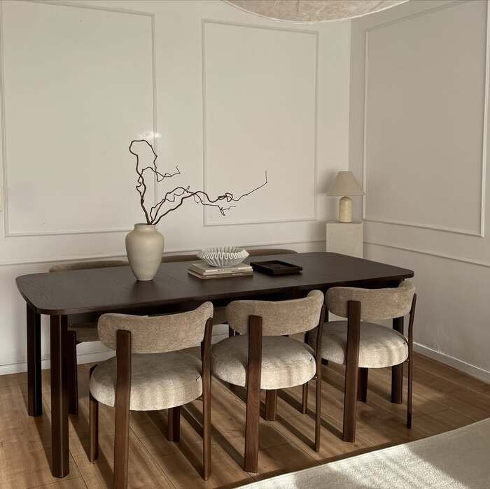If clutter stresses you out, try this: one vase with branches, one small stack of books, and stop. In tight rooms, armless chairs tuck in better, which is huge for small dining area decor ideas. Add a linen runner if you want warmth. Keep colors close, like tan, cream, and dark wood.