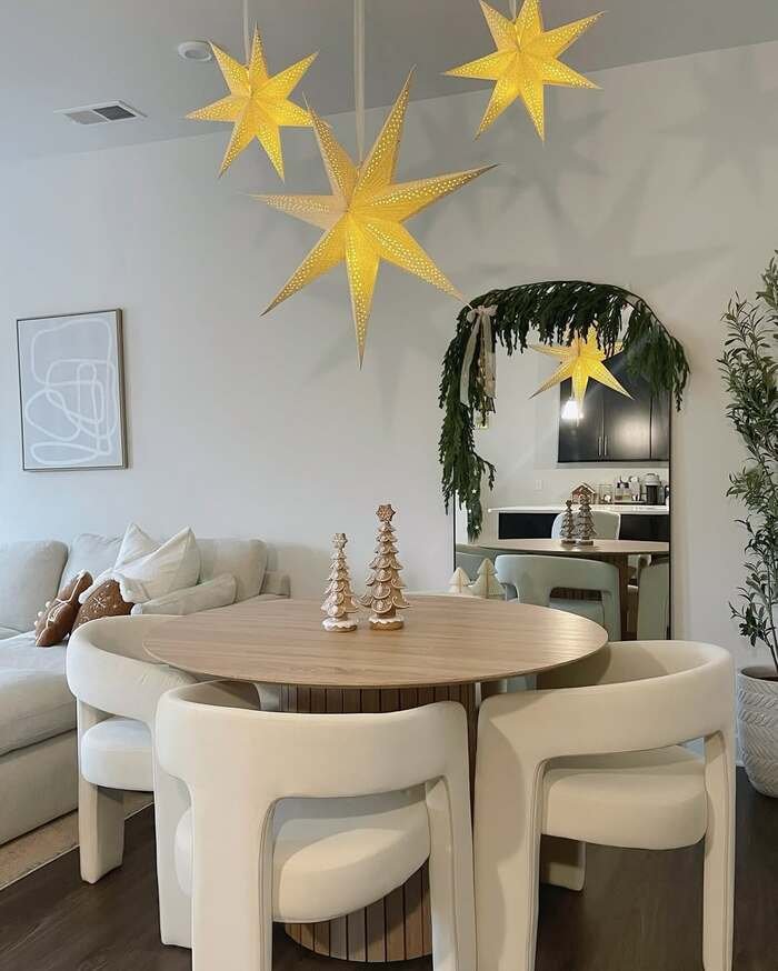 Round shapes help in small rooms because you bump into fewer corners. Keep your centerpiece low so you can see faces. For small dining room styling ideas in open plans, a statement light anchors the table. If you can’t hardwire, a plug-in swag pendant works, or even paper star lamps. Add a little greenery if you want softness. If stars are too much, swap in a single globe light, but keep the fun chair shape.