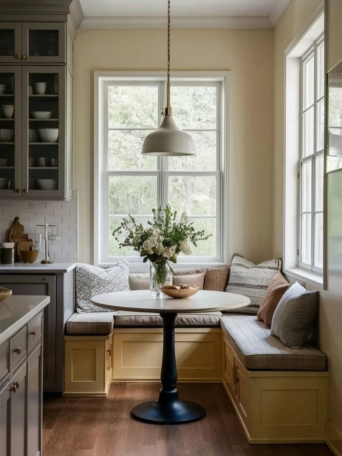 Practical tip: use a round table if your nook is tight. Corners on small tables love to bruise thighs, I swear. A round table makes it easier to slide in and out. And add a pendant light like the photo, because overhead lighting makes a nook feel “real,” not like it’s just a random corner you gave up on.