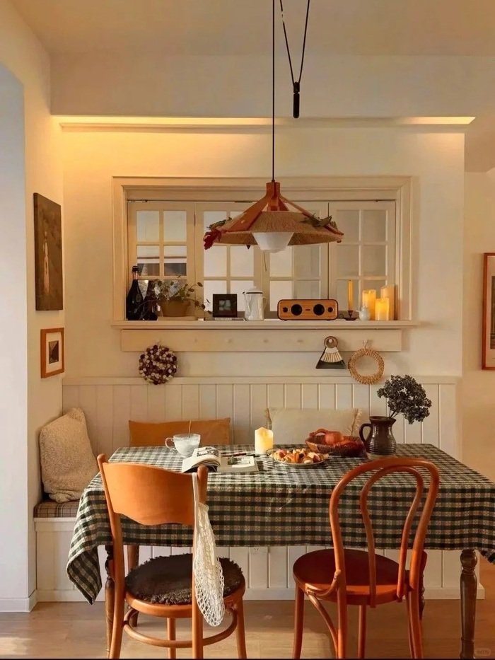 This first nook feels like a warm hug. It’s a simple table pushed close to a wall, with a green checkered tablecloth that instantly says “sit down, slow down.” I like the way the pendant light hangs low, because it makes the table feel like its own little world. The shelf ledge behind it is doing a lot too. It holds candles, small frames, and tiny decor without taking floor space, which is basically the whole point of small dining room ideas decor.