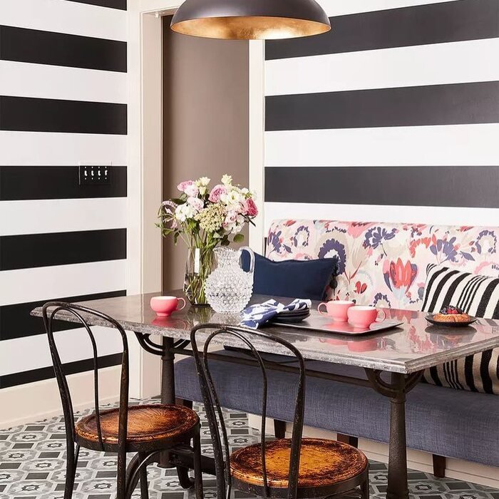 Okay, this one is loud in the best way. The black and white striped walls make the space feel graphic and fun, and the banquette has a colorful pattern that keeps it from feeling too serious. It’s the kind of small dining room ideas decor that makes guests go, “Wait, this is adorable,” even if the room is tiny.