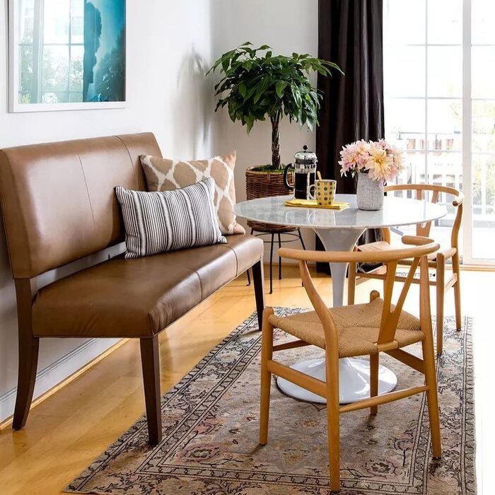This one is bright, clean, and super practical. The round table is the star because it keeps the walkway open, and the bench by the window makes it feel cozy without adding chair clutter. I love how the rug anchors the table area too. Rugs in small spaces sound risky, but they actually help define the zone, especially when your dining spot is part of the kitchen.