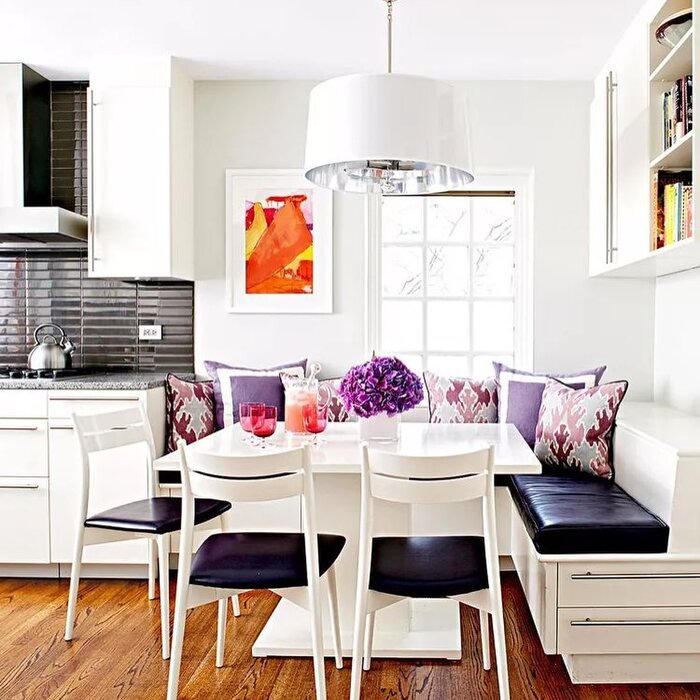 This last one is bright and fun, like it refuses to be boring. The U-shaped banquette wraps around the table, which is genius for tiny dining zones because it fits more seating without spreading out chairs. The pillows are bold, with purple and patterned fabric, and the lighting is big and modern. It’s one of those small dining room ideas decor setups that makes a small corner feel like the main event.