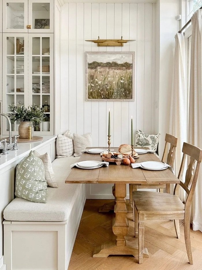 This space is clean and bright, and it feels like fresh air. There’s a built-in bench along the wall, a warm wood table, and a simple painting above. Nothing is screaming for attention, which makes the whole room feel bigger. This is my favorite kind of small dining room ideas decor because it doesn’t require 50 little decorations.
