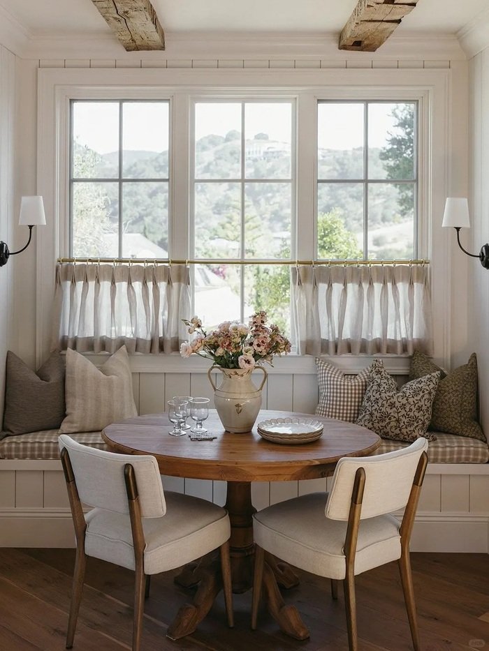 A small hack: choose pillows in the same color family but different textures. Like linen, knit, and a tiny pattern. That makes the bench look layered without looking chaotic. And keep your centerpiece simple, like one pitcher vase with flowers. Too much stuff on a small round table feels crowded fast.