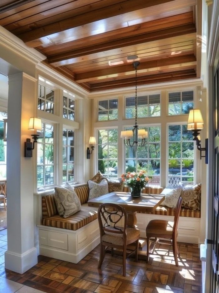 Sunroom-Style Banquette With Wood Ceiling That Makes