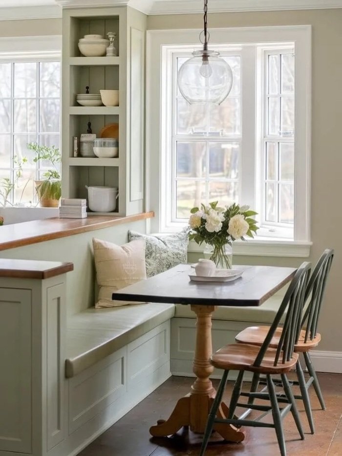 Soft Green Built-Ins + Simple Table for Small Dining Room Ideas Decor That Actually Functions