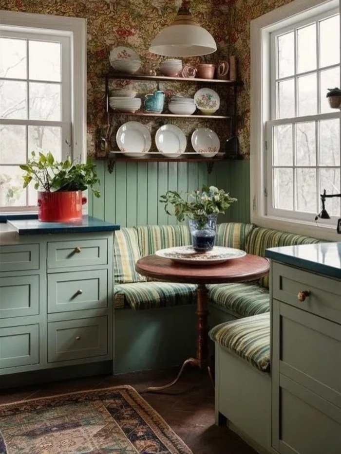 This nook has strong cottage energy. There’s wallpaper, painted lower walls, and open shelves holding plates and bowls. It feels collected and slightly old-fashioned in a charming way, like someone’s grandma’s kitchen but updated. It’s such a bold small dining room ideas decor choice, and I respect it.
