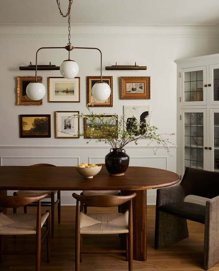 This first room has that “grown-up cozy” feeling, and it starts with the wall. The gallery wall is made of framed art in different sizes, but it still looks organized. That’s the trick with small dining room wall decor. In a tight space, random art placements can make the room feel chaotic fast. Here, the frames feel like they’re in conversation with each other. Also, those globe pendant lights act like wall decor too because they sit visually in front of the art. It’s layered, but not messy.