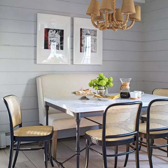 This room is calm, bright, and super practical. There’s a bench along the wall and two simple frames above it. That’s it. And it works. In a small dining room, simple small dining room wall decor can feel more expensive than busy decor. Those two prints are evenly spaced, the chandelier is soft and textured, and the whole thing feels like a cozy cafe corner.