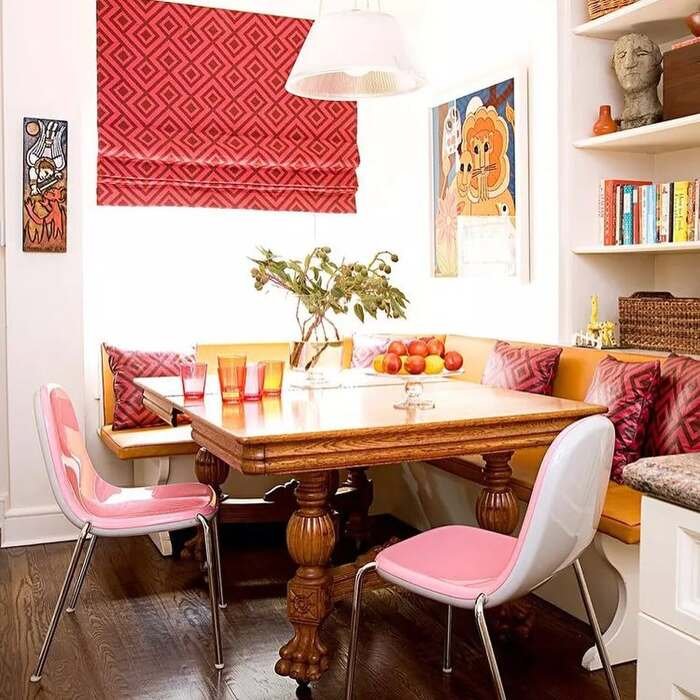 This nook is tiny but it feels like a happy little cafe, mostly because the wall and textiles are doing the work. You’ve got one bold art piece on the wall, then the pillows repeat the same “bright but cozy” feeling. That’s a sneaky small dining room wall decor trick: you don’t need 10 frames. You need one punchy print, then echo the color somewhere else so it looks planned. The big pendant light also helps frame the nook, like it’s putting a spotlight on the table.
