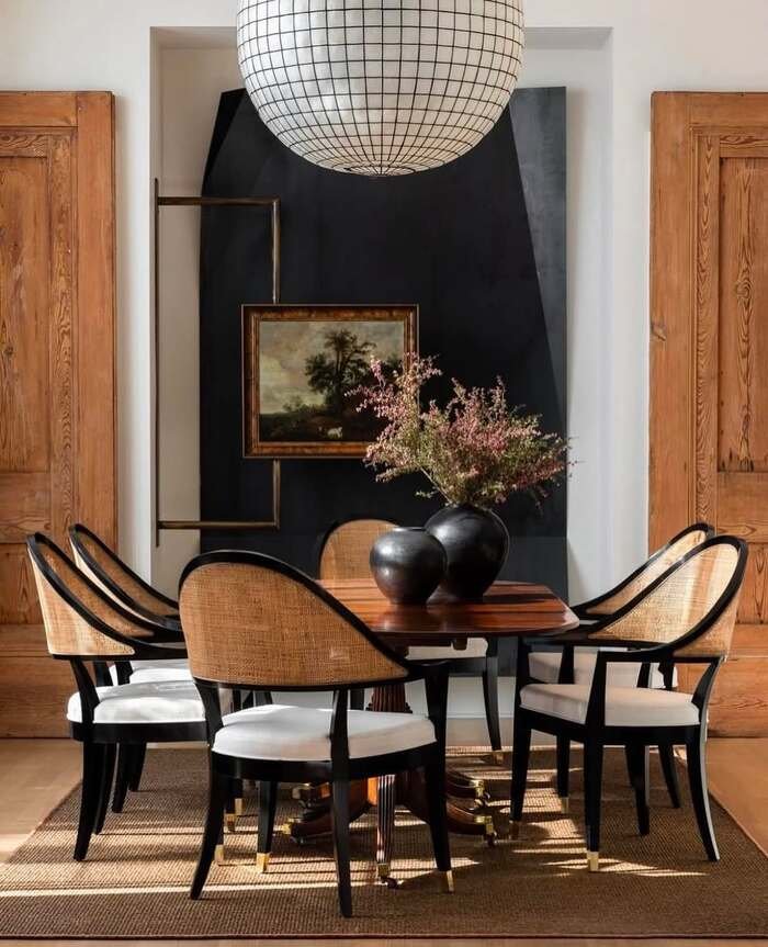 This next setup has a dark painted shape behind the table, and it’s so smart. It creates a focal point without needing a million frames. When you’re short on wall space, small dining room wall decor can be paint, not stuff. The black shape adds drama and makes the furniture look more expensive, even if it isn’t. The oversized grid pendant above also feels graphic, like it’s part of the wall design.