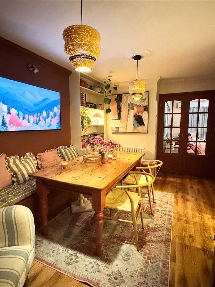This dining space is small and cozy, like the kind of place you sit too long and then suddenly it’s midnight. The big thing here is the banquette along the wall and the oversized art above it. The wall art doesn’t feel “perfect,” and I mean that in a good way. It feels collected. For small dining room wall decor, one large piece is a cheat code. It takes up space on the wall without creating visual clutter.