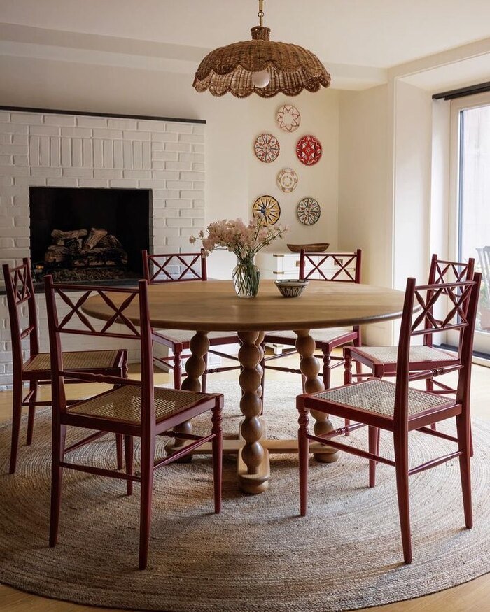 If you want to do this, pick a color story. Here it’s warm tones that match the chairs and pendant. My trick: start with the biggest plate in the center, then build outward like a little constellation. Keep spacing around 2 inches. And don’t hang them too high. Plates look best when they sit closer to eye level, like artwork. You can thrift plates, buy new ones, or mix both. Just keep the “vibe” consistent. If you mix super modern plates with super vintage ones, it can look confused.