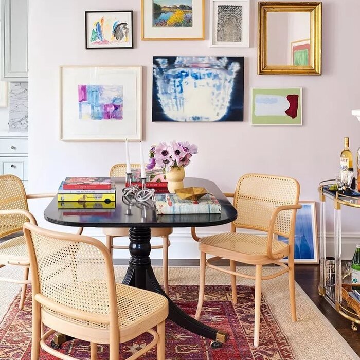 This space has a whole art wall, and it’s bright and fun. A gallery wall in a small room can work if you keep the table and chairs simple. That’s what’s happening here. The chairs are cane and light, the table is dark and grounded, and the wall is basically the party. This is great small dining room wall decor for people who want personality, not perfection.