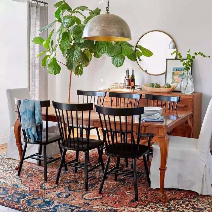If you want to copy this, choose one big overhead light that fits the scale of your table. Bigger is usually better than you think. My hack: keep the wall mirror round if your furniture is more boxy. Round shapes break up harsh lines. And add a simple picture frame or print on the wall, but don’t overcrowd it. If your plant is tall, let it be the “art” on that side. Too much decor around a big plant can look cluttered. Plants already have visual drama.