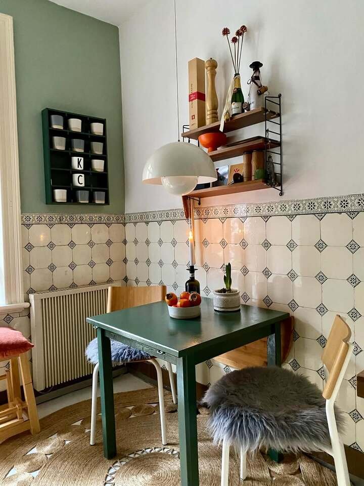 This last space is cheerful and quirky, like it has a sense of humor. The wall has a patterned tile border, open shelves with cute objects, and paint that actually has color. This is one of those small dining room wall decor ideas that feels alive, like the room is smiling at you.