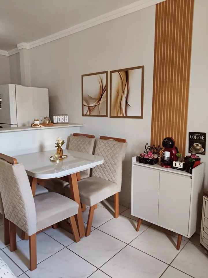 This first space is proof that one simple vertical accent can save a whole room. The wall is mostly plain, but there’s a tall wood-slat stripe running floor to ceiling, like a clean little runway. Then it’s paired with two matching framed prints, and suddenly the dining corner looks put-together instead of like “we shoved a table here and hoped for the best.” It’s one of those small dining room wall decor ideas that feels modern without being cold.