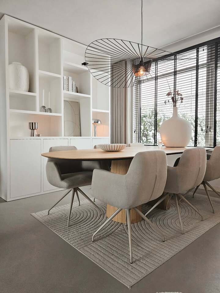 Also, the big sculptural light over the table pulls your eyes up, so the shelves feel even taller. If you can’t do a built-in, you can still get this feel with a wall of modular shelves or a long low cabinet with open shelving above. It’s still a solid small dining room wall decor idea, just in an easier version.