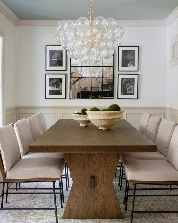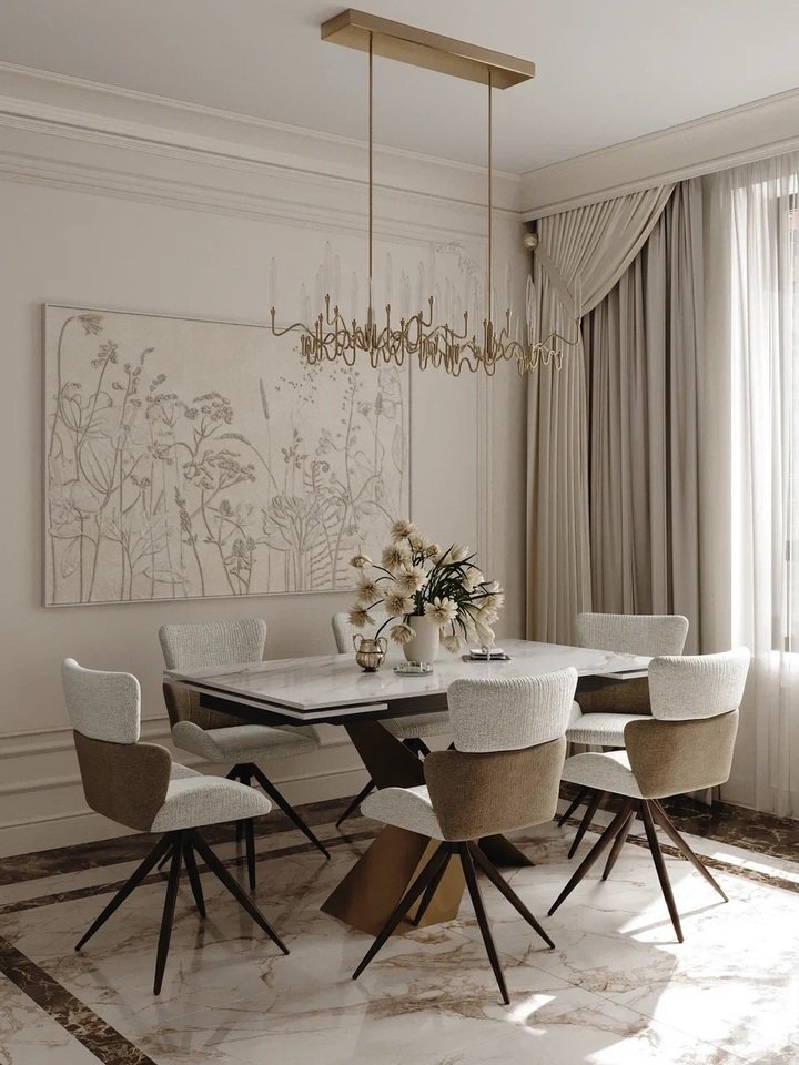 If you want this look, choose art with a lot of negative space. Think thin lines, light backgrounds, simple shapes. Then hang it a little lower than you think. In dining rooms, you want art to connect to the table, not float up near the ceiling like it got lost.