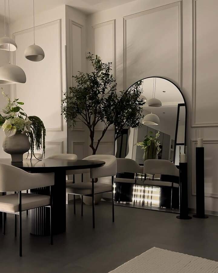 This dining room is darker and moodier, but the giant arched mirror basically saves it. The walls have molding, the furniture is sleek, and the mirror is leaning against the wall like it owns the place. I’m obsessed with this small dining room wall decor idea because mirrors are like cheating. They add “space” without actually adding space.
