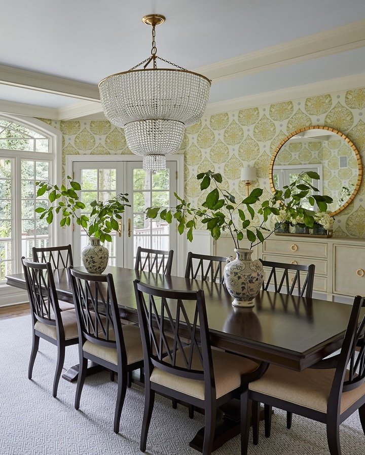 This room is brighter and more traditional, and the wall is wearing a patterned wallpaper that feels happy, not loud. Then there’s a round mirror above a sideboard, and a big chandelier overhead that makes everything sparkle. It’s a wall decor idea for a small dining room that leans classic, but it still feels fresh because the mirror breaks up the pattern.
