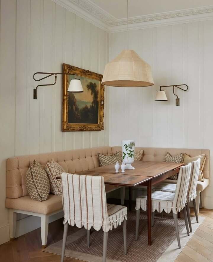 This one is a corner banquette that looks like it’s hugging the table. The walls are simple vertical paneling, there’s a big woven pendant overhead, and two swing-arm sconces on either side. Plus a vintage-looking framed painting. It’s a small dining room wall decor idea that makes the wall feel warm and useful, not just blank background.