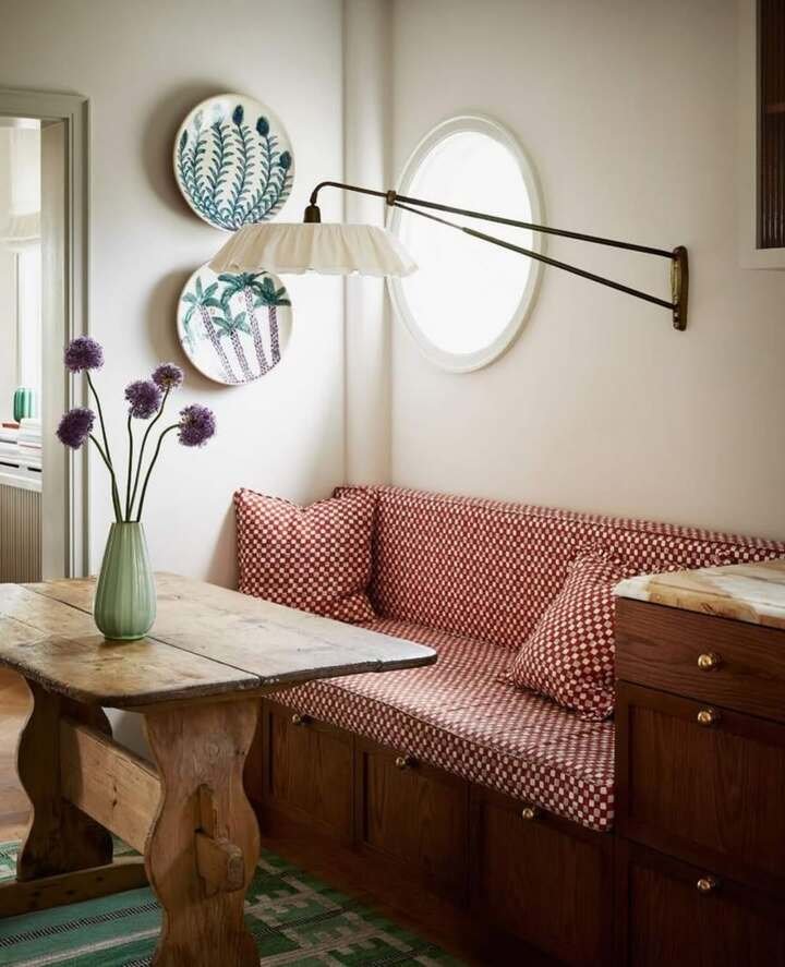 I know, plates on the wall can sound like “my aunt’s house,” but this dining nook makes it look cool. The wall has a little collection of plates arranged like a loose cluster, and it works because everything else is simple. There’s a round window, a swing-arm wall lamp, and a banquette with patterned cushions. It’s a small dining nook wall decor idea that’s playful, and honestly kinda charming.