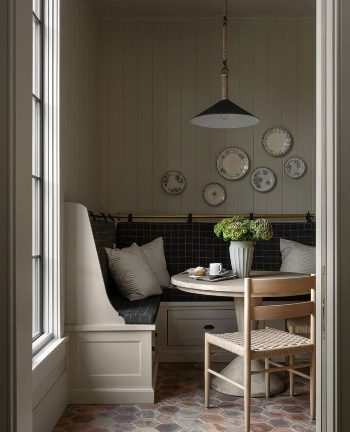 If you’re doing a moody nook, you have to think about balance. Keep the plate wall light in color so it pops. Use a simple pendant that isn’t too big, because a giant shade can make a small nook feel squished. And add one soft pillow so the banquette doesn’t look stiff.