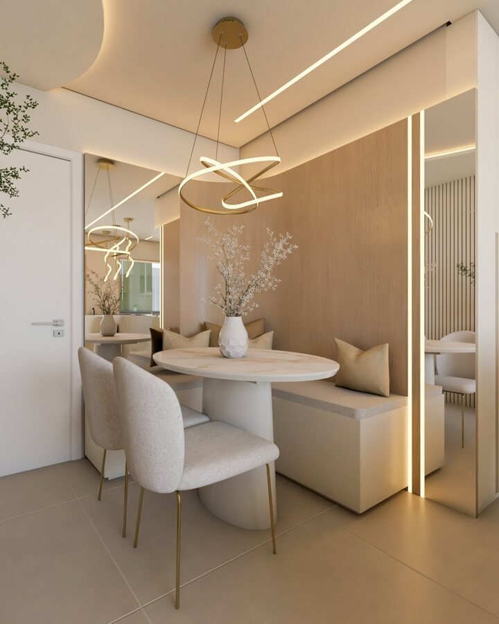 This room is all curves and soft materials, and it looks so comfortable I kind of want to nap at the table. The pendant is sculptural, the chairs are upholstered, and the wall has a few simple rounded accents. This is a tiny dining room wall decor idea that leans on shape, not clutter.