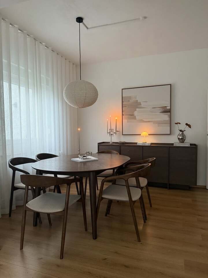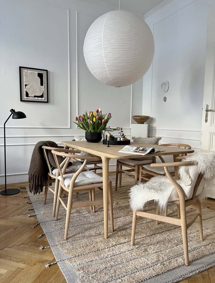 This space is simple in a way that feels kind of brave. A big paper lantern hangs over a light wood table, the walls are clean with subtle molding, and the decor is mostly texture. It’s a small dining room decor and wall art approach that says, “I don’t need noise to feel styled.”