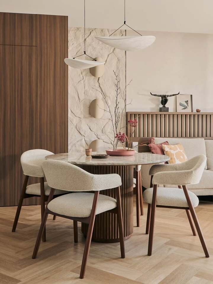 To get this vibe, keep your palette warm and creamy. Then choose wall decor that has rounded forms, like plaster discs, simple ceramic pieces, or even a textured wall panel behind the table. If you can add one fluted or ribbed surface somewhere (like a table base or a sideboard), it adds depth fast.