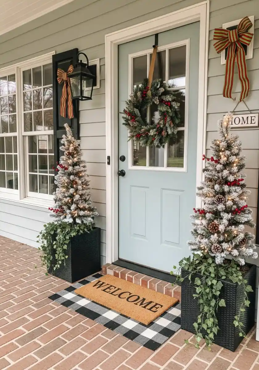 Why it works: a cool palette that still feels wintery. Flocking behaves like built-in snow for front porch Christmas decor ideas that need that December mood.