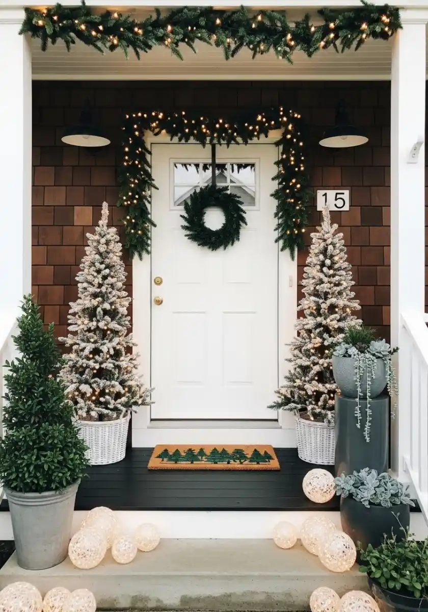 Two pencil-thin flocked trees in white baskets flank a simple white door trimmed with lit garland. At the step, globe string lights puddle like glowing snowballs. On one side, stacked planters filled with succulents add texture while keeping the footprint tiny.