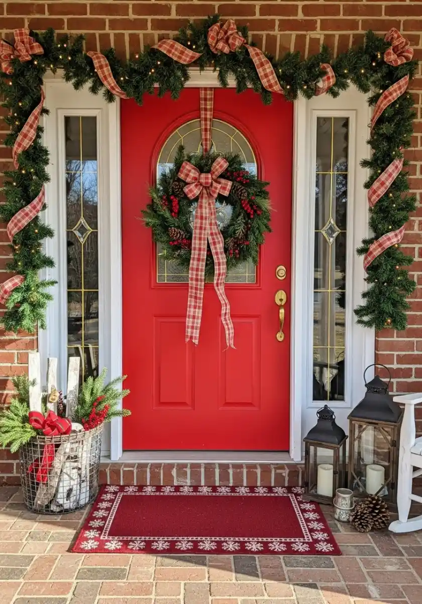 That classic wreath with plaid ribbon and berries lands at the center of a vivid red door. The same ribbon runs through the doorway garland so everything relates. Lanterns, a log basket, and the layered doormat echo the tones.