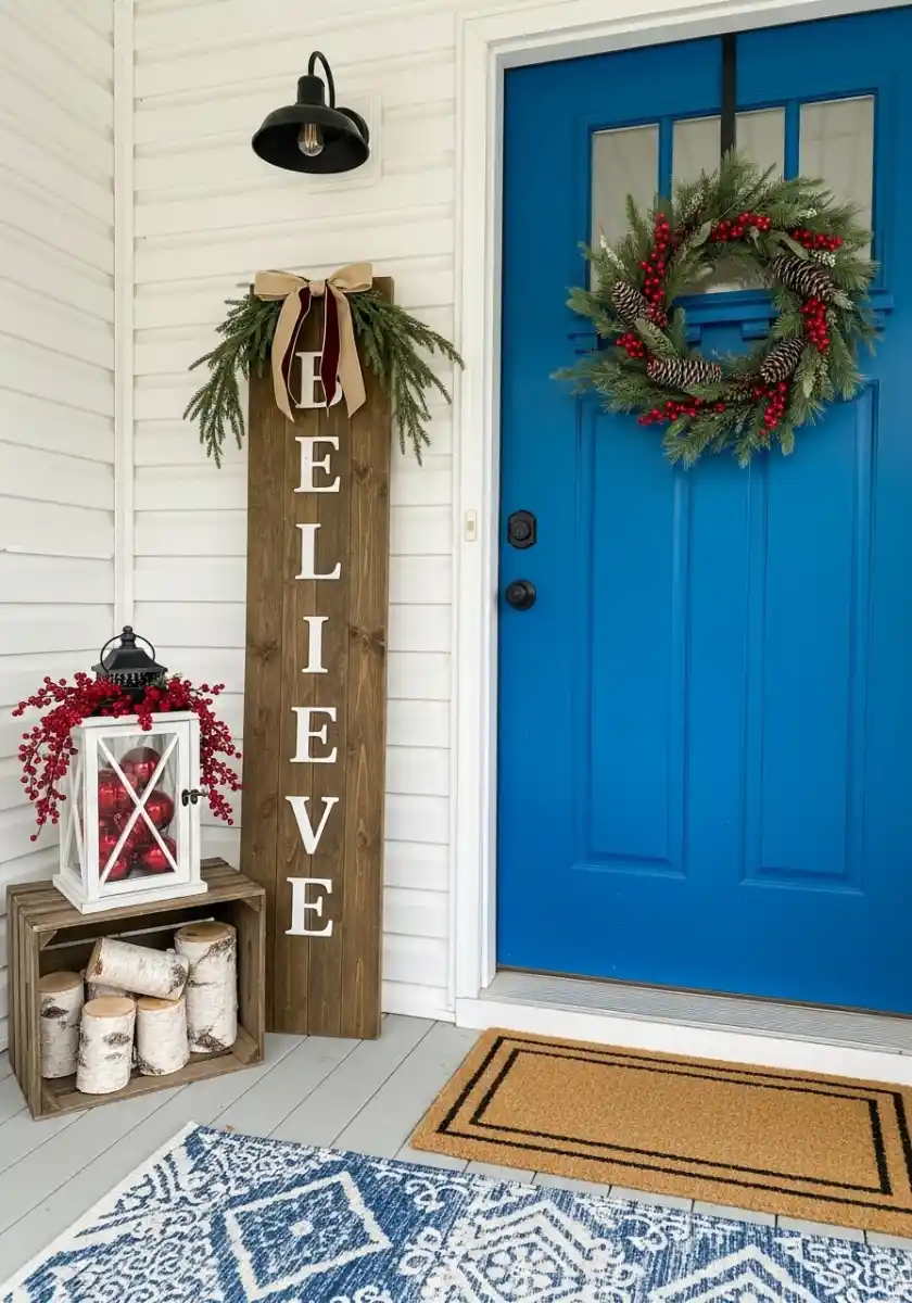 This vivid blue door already shouts happy, so the decor stays simple. A tall wood sign that reads BELIEVE adds drama without using floor space. A white lantern filled with red ornaments sits on stacked crates with birch logs, and a wreath packed with berries and pinecones ties the colors back to the door.