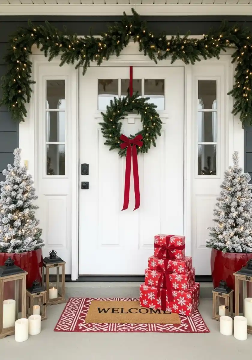 A pre-lit garland frames the white door and a simple wreath hangs on a long red ribbon. On each side, flocked mini trees in shiny red planters hold the corners. In the middle, a stack of red-and-white gifts becomes the focal point, with lanterns and candles clustering low for evening glow.