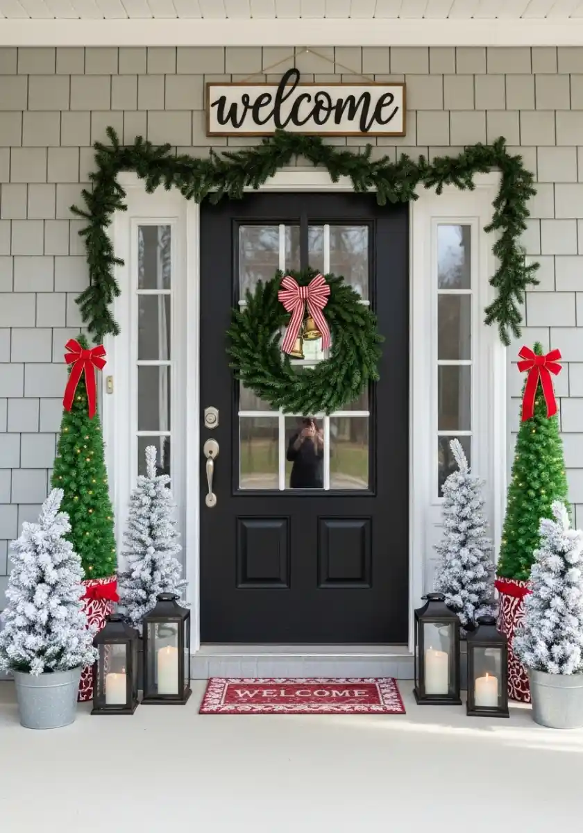 A white door gets a thick wreath with a long velvet ribbon. Above, a swooping roofline garland with a bow repeats that ribbon moment. Two mini trees in glossy red urns flank the entry like toy soldiers, and wood lanterns march down the steps for soft light.